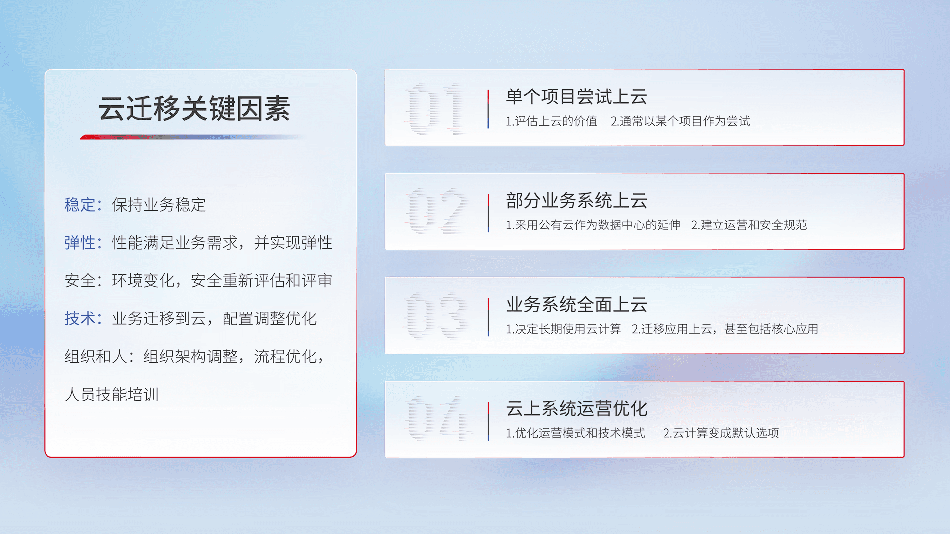 结合实际业务,,从规划设计、、、云平台选型、、、云原生改造、、数据迁移、、集成交付,,,,迁移全过程为客户识别最佳上云路径,,,做好风险识别管理,,,设计网络架构、、、、身份权限、、、、安全审计合规、、操作审计、、、日志审计、、监控告警策略、、多站点容灾设计等,,对云上基础设施进行整体规划,,提升IT治理水平,,以满足弹性、、高可用、、高性能的需求。。。。